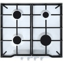 Поверхность: варочная панель • Тип поверхности: газовая • Рабочая поверхность: эмаль • Число конфорок: 4 • Установка: независимая • Газ-контроль конфорок: есть • Тип управления: механическое • Переключатели: поворотные • Электроподжиг: есть, автоматический • Размеры: 590x520x94 мм • Размер ниши для встраивания: 560x500 мм • Цвет: панель - белый
