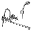 Длина излива - 320, Комплектация - Держатель душевой лейки, душевой шланг, ручной душ, Тип - Двухзахватный, Встраиваемый - Нет, Назначение - Для ванны и душа, Количество монтажных отверстий - 2, Материал корпуса - Латунь, Покрытие - Хром, Термостат - Нет, Аэратор - Есть, Присоединительный размер - 1\2", Высота - 10.4, Форма излива - Традиционная, S-образные эксцентрики - Есть, Тип подводки - Жесткая, Цвет - Серебристый, Ширина - 22.1, Поворотный излив - Да, Донный клапан - Нет, Глубина - 12.15