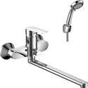 Присоединительный размер - 1\2", Донный клапан - Нет, Цвет - Серебристый, Количество монтажных отверстий - 2, S-образные эксцентрики - Есть, Покрытие - Хром, Ширина - 21.5, Термостат - Нет, Длина излива - 403, Глубина - 41.8, Комплектация - Душевой шланг, Поворотный излив - Да, Встраиваемый - Нет, Материал корпуса - Латунь, Тип - Однозахватный, Тип подводки - Жесткая, Аэратор - Есть, Назначение - Для ванны и душа, Форма излива - Традиционная