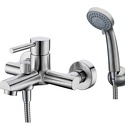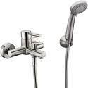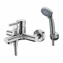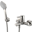 Назначение: ванна+душ • Конструкция: однорычажный • Монтаж: вертикальный • Клапан: керамический • Материал: латунь, покрытие - хром • Подводка: жесткая • Монтажные отверстия: 2 отверстия • Форма излива: традиционная • Душевая лейка в комплекте: есть • Держатель для душевой лейки: настенный держатель • Донный клапан в комплекте: есть