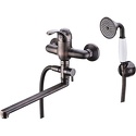 Назначение: ванна+душ • Конструкция: однорычажный • Монтаж: вертикальный • Клапан: керамический • Материал: латунь, покрытие - бронза • Подводка: жесткая • Монтажные отверстия: 2 отверстия • Форма излива: традиционная • Душевая лейка в комплекте: есть • Держатель для душевой лейки: настенный держатель • Аэратор: есть